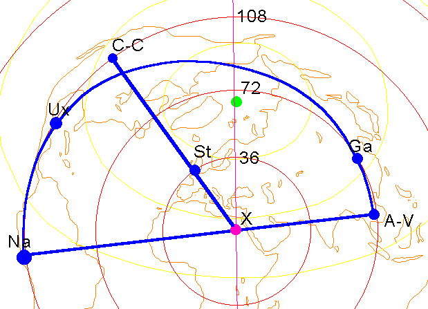 The first map is a Mercator projection. The second map is built according to the principle of a stereographic projection centered on the point X (intersection of the meridian of Alexandria and of the tropic of Cancer). From this point, I have traced  the circumferences the radiuses of which equal 36, 72 (2x36), 108 (3x36) et 144 (4x36) degrees.