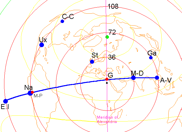 On the scheme, I've chosen the colour green to represent, for each site, a segment of the parallel along which the zenith culmination of the indicated star could be seen (as well as the latitude of this parallel).