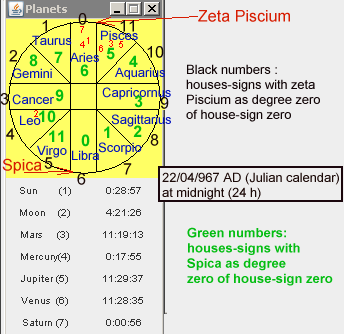 Sun, Mercury and Saturn (red numbers 1, 4 & 7) were located in the house-sign 0 (numbers written in black colour in the figure). With zeta Piscium used as degree zero (usual convention), the three objects were crossing, roughly, the Aries constellation. (more precise data provided by http://ancientcartography.net/22-04-967-midnight-4.pdf ) It is worth remembering the houses-signs were numbered from 0 to 11. ( F.G. Faraut : « Astronomie cambodgienne ») - Mars, Jupiter and Venus (red numbers 3,5 & 6) were located in the house-sign 11 which corresponded to Pisces. - The Moon (red number 2) was crossing the house-sign 4 which corresponded to Leo Those locations are confirmed by modern software.
