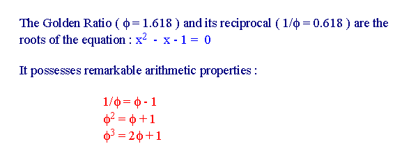 Let's consider the golden rectangle ABDC (AB/AC = 1.618). If we remove the square EBDF, we obtain a new golden rectangle AEFC (indeed, we see that the ratio EF/AE equals 1.618). The operation is repeated as many times as we wish and, in the squares which are obtained in that way, arcs of circumference (represented in blue) are traced.