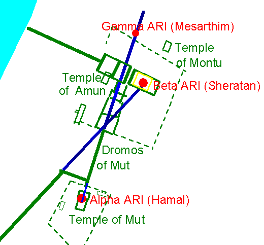 It seems most likely that the contellation projected on the Theban soil was associated with a ram. About this, let's remember that criosphinxes (ram-headed sphinxes) can be seen in the Temple of Amun and along the dromos (processional avenues).
