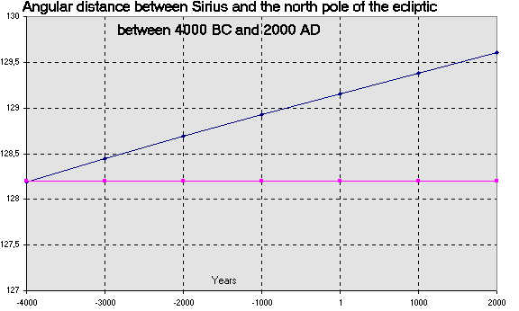 As we can see, the angular distance between Sirius and the North Pole of the ecliptic (vertical axis) equalled the supplement of the angle phi in 4000 BC. In other words, the angular distance between Sirius and the South Pole of the ecliptic equalled, in 4000 BC, the angle phi (51.8°). Two thousands years later, at the time of Sesostris I, a difference of 0.5° was noticed between this "ideal" value and the existing angular distance. It's most likely that this difference was not seen as meaningful by the Egyptians. Moreover, the astronomers of the time may not have been able to determine the polar distance by 0.5° .