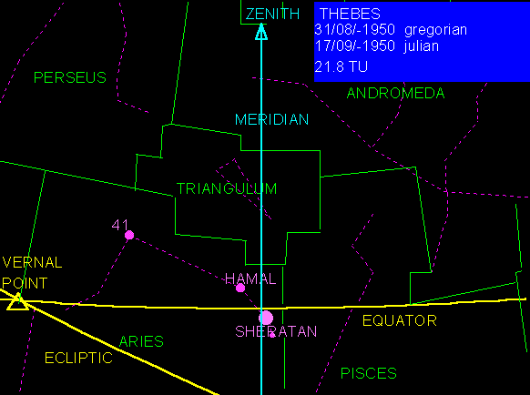 Sheratan crosses the meridian and Aries (the Ram) holds, in the sky, a position that reminds the observer (standing at point C) that of the terrestrial projection. Indeed, for the observer, the projection of Sheratan is on the geographical meridian whereas Hamal-bis and 41-bis are seen on its left (points D, G and B on the graph of the site).