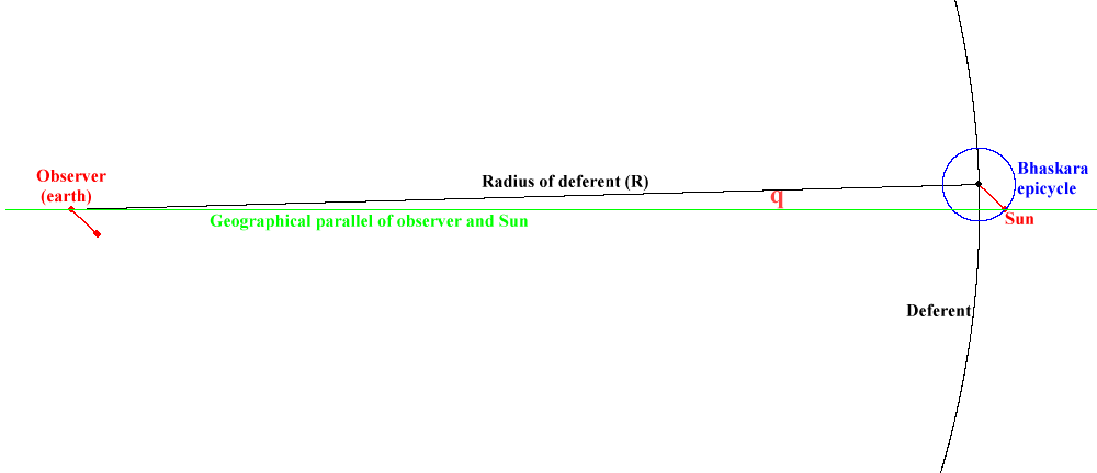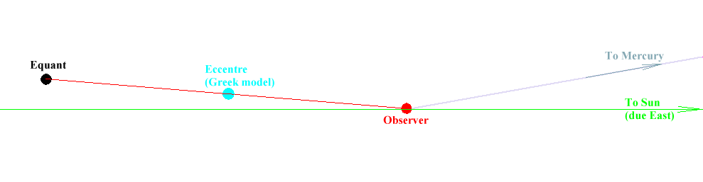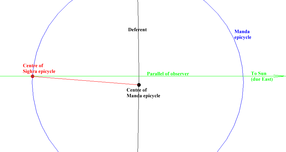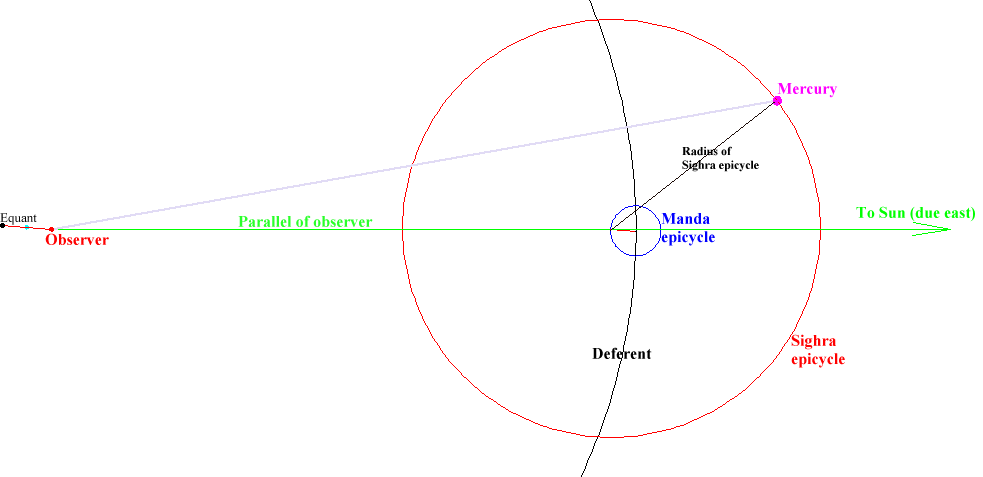 In the case of an inner planet (Mercury on the diagram), the centre of the Sighra epicycle is located on the straight line running through the observer and the Sun ie, in this case, on the geographical parallel of the observer.