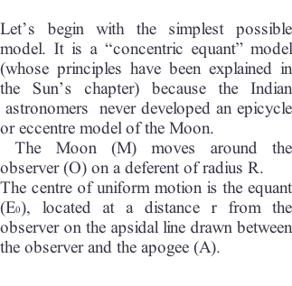 At the beginning of the sixth century, Aryabhata developed the “concentric equant” model : the Sun moves on a circle of radius R called a “deferent” whose centre is the earth (observer). That means the distance between the earth and the Sun is constant. The motion of the Sun is uniform as seen from a point called “equant” which is located at a distance R x e from the earth (observer) in the direction of the apogee (e = eccentricity). That means the motion of the Sun is not uniform as seen from the earth.