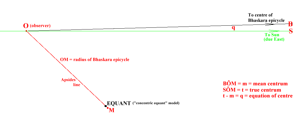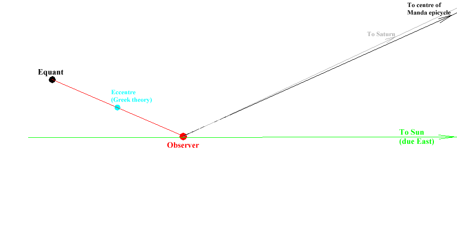 An important point, called the " equant ", is located on an apsides line drawn parallel to the radius of the Manda epicycle but running through the observer. The distance between the observer and the equant is twice the radius of the Manda epicycle. The mid-