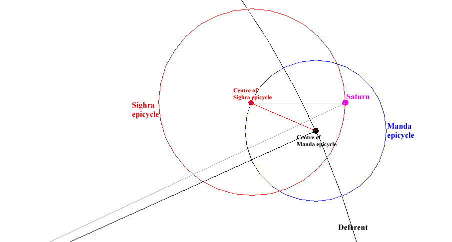 In the case of an outer planet (Saturn on the diagram), a circle called " deferent " is drawn from an " observer " which is supposed to stand on the Earth. The centre of another circle called the " Manda epicycle " rotates around the observer, travelling around the deferent.